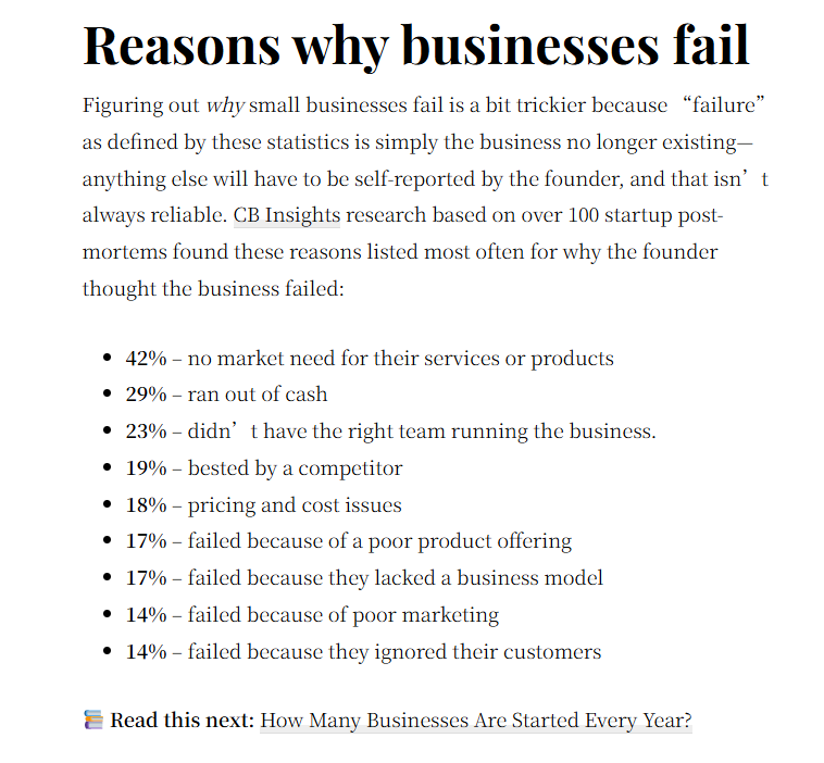 That means businesses are actually going bust because they are not able to carry out the fifth step, which is to reinvest into finding more work, but if there is no work, then the cycle just stops. 42% fail because they didn’t have any demand and 21% fail because they ran out of money. It might be because their margin shrank too much and step 2 or 3 got unviable. But again, step 2 and 3 going unviable downstream means you cannot do step 5.
