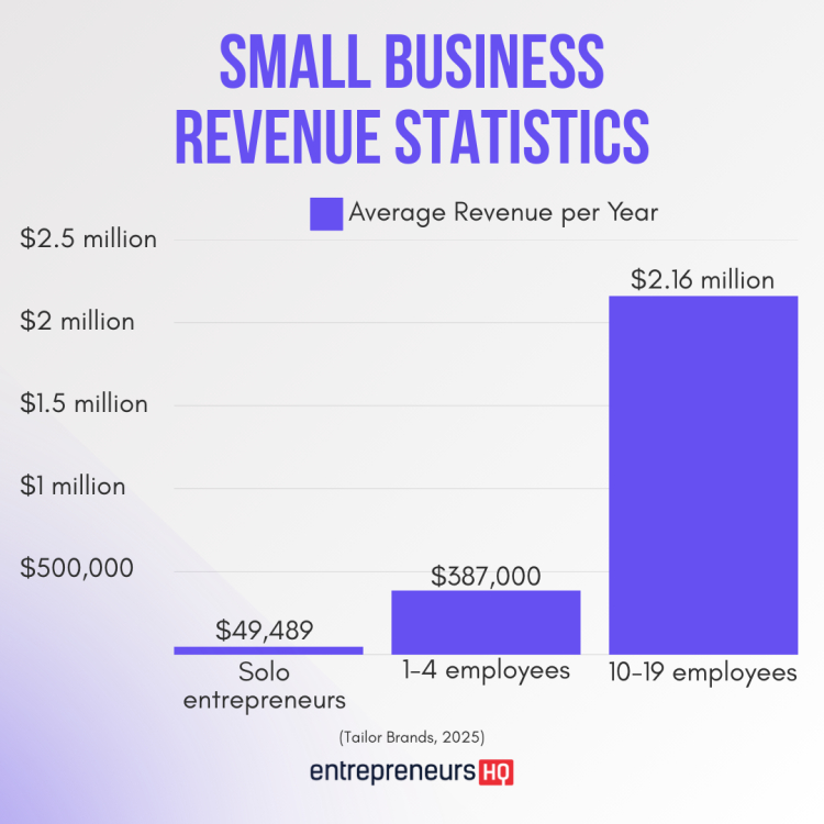 I think the period between 1 year and 5 years is the most treacherous one because that is when you are supposed to build systems, standardize services, and solidify ICP and delegate the fuck out of the business. Without that, the founder fatigue will be too much. The emotional decisions over years will just rot you inside out. I think the failure to systemize is what takes businesses out during the period we are talking about. Hopefully, you are systemizing something that is financially viable. Plus delegation is really cool! Down below, I have attached an infographic that shows how firms with more employees generally have greater revenue. And it’s a greater than sum of parts type of arrangement. Like a solo guy is making around $50K, but 4 people are able to make way more than what would be $50k *4 workers . $387k to be precise.