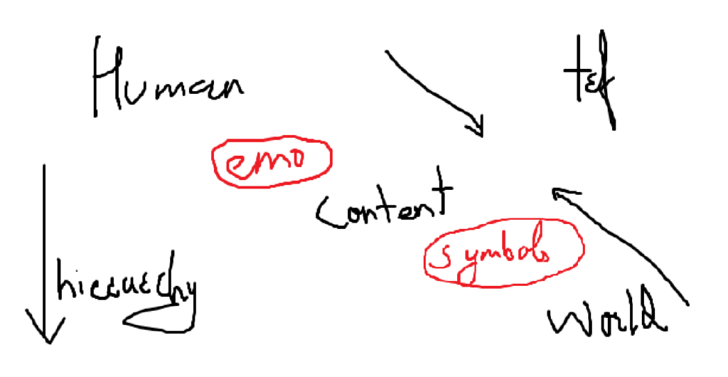 But content is the point where we are trying to create something. So from the human side, emotions come down and from the world we bring in symbols that are compatible with the emotions and the humans we are after.